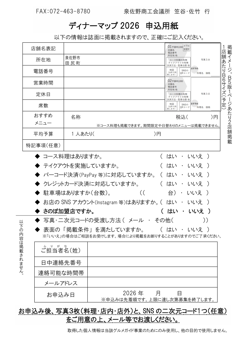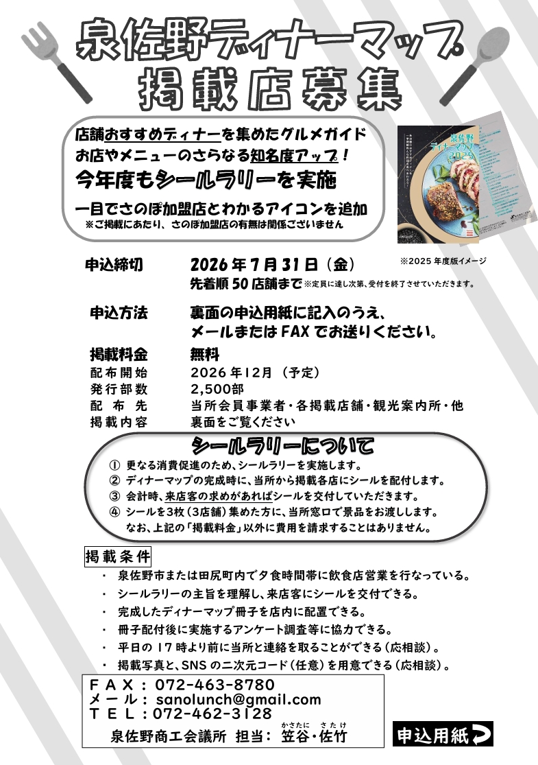 『泉佐野ディナーマップ2026』掲載店募集