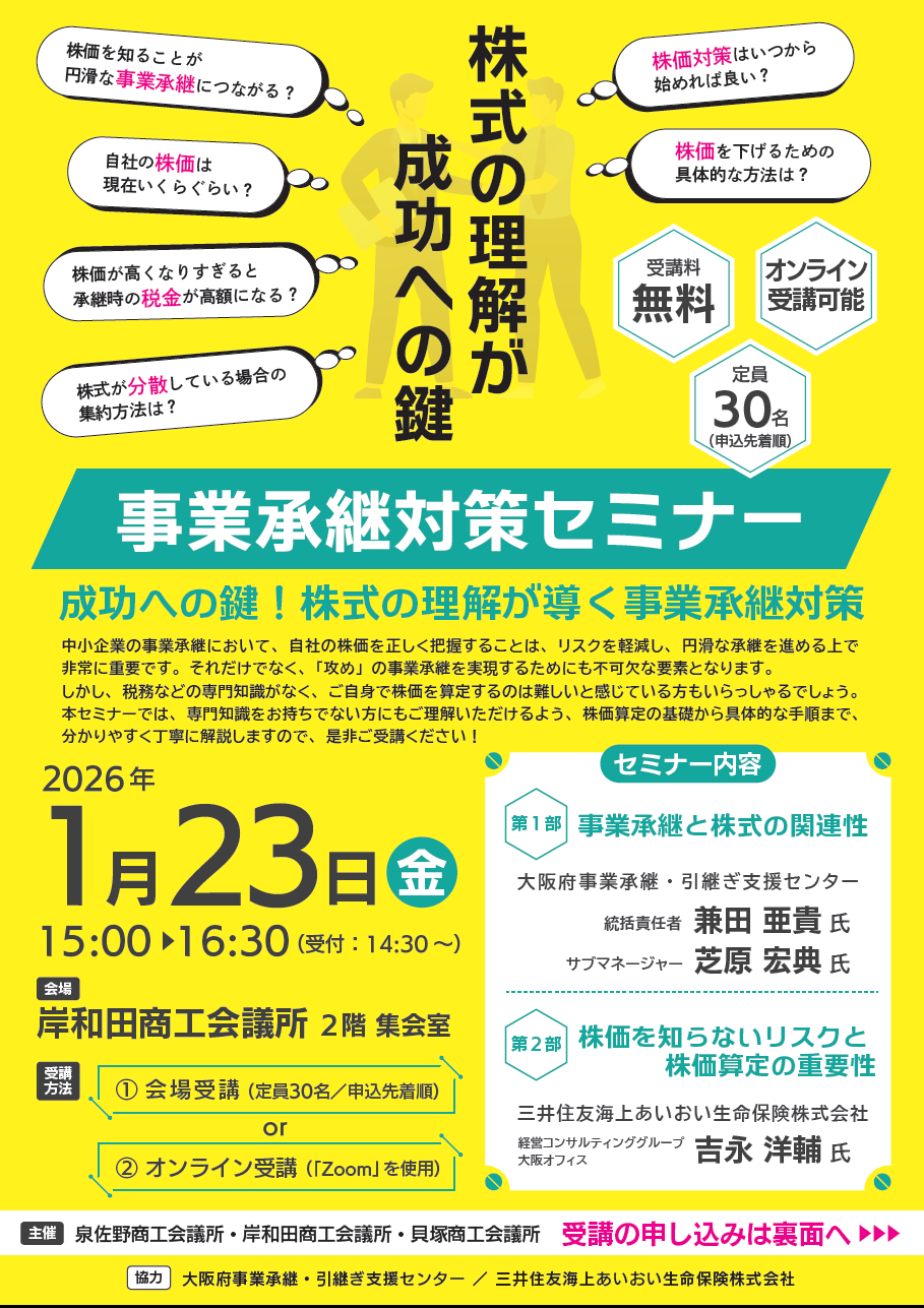 1月23日㈮開催 事業承継対策セミナー ~成功への鍵!株式の理解が導く事業承継対策~