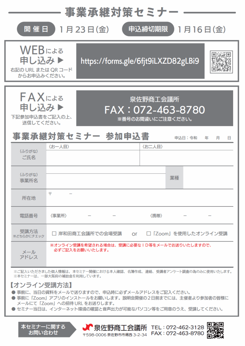 ①WEB申し込み⇒https://forms.gle/6fjt9iLXZD82gLBi9 ②FAX申し込み⇒申込用紙にご記入のうえFAXにてお申込みください |